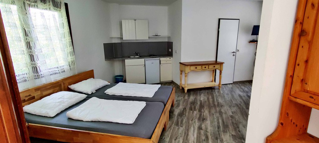 Die Ferienwohnung ist mit einer kleinen Küchenzeile, eigenem Bad mit Dusche einem Tisch und zwei Doppelbetten (140 cm und 180 cm) ausgestattet.